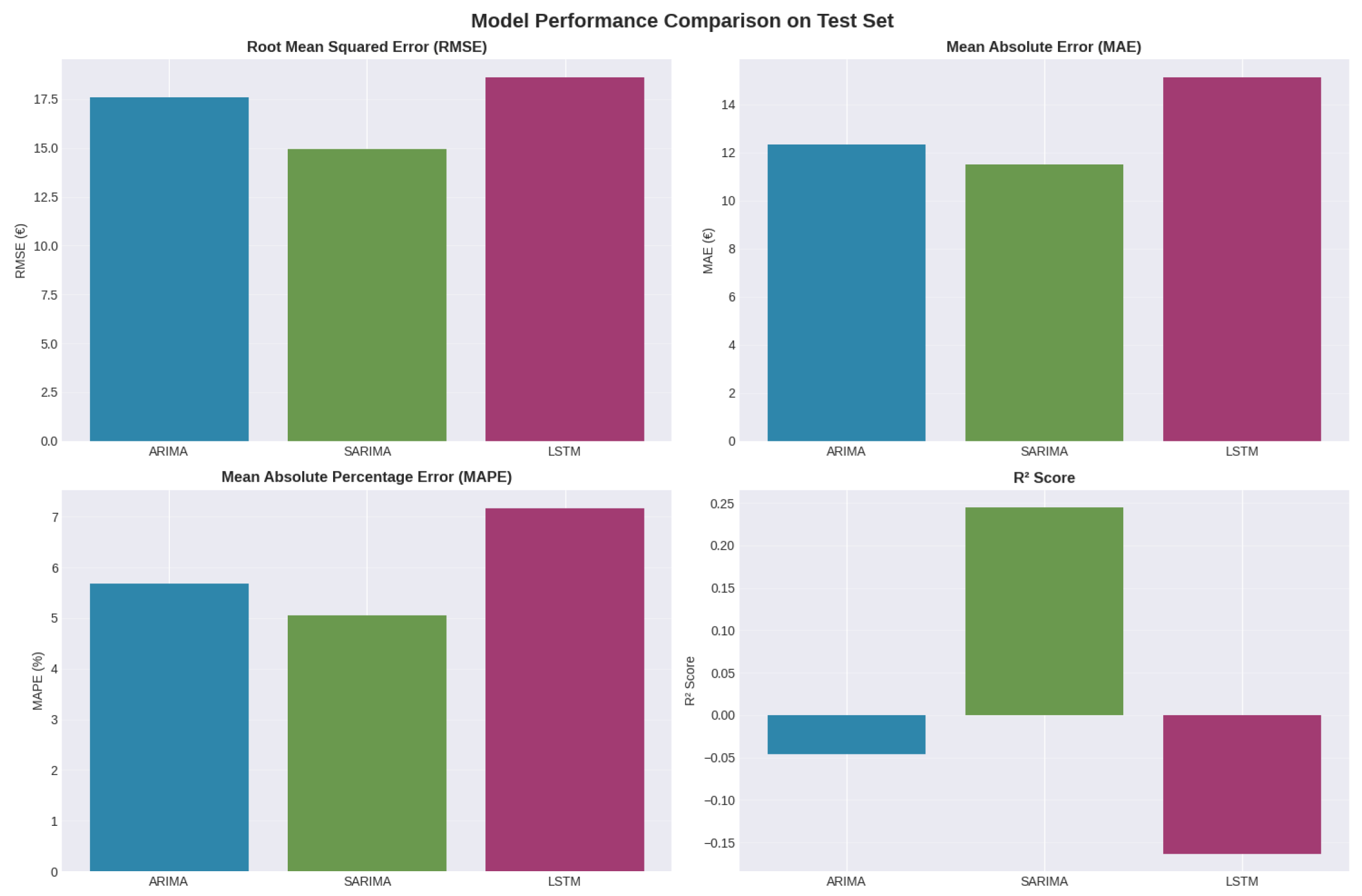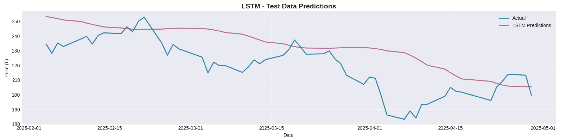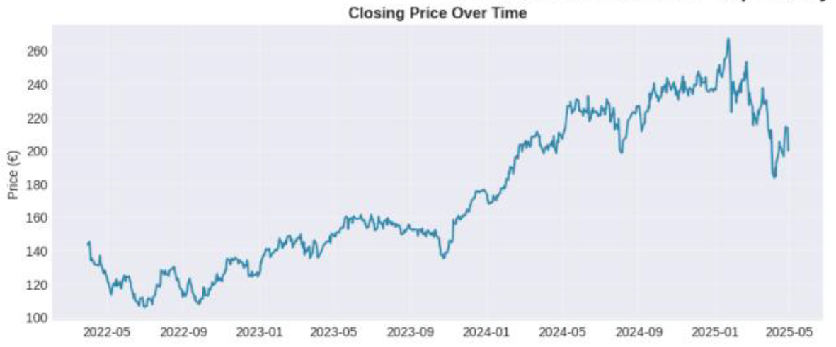 We conducted a comparative study of statistical and deep learning approaches for forecasting stock prices. Historical daily market data for Schneider Electric was collected and analyzed to understand temporal patterns, volatility, and seasonality. After preprocessing and exploratory analysis, the time series was transformed to achieve stationarity and then partitioned into chronological training, validation, and testing sets. Three forecasting models—ARIMA, SARIMA, and LSTM—were trained and evaluated to assess their predictive performance under realistic forecasting conditions.