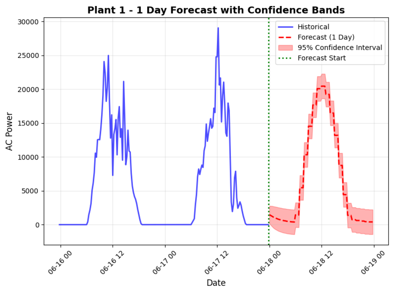 A time-series forecasting approach was used to predict solar power generation based on historical production data and weather variables. The generation dataset was merged with environmental measurements such as solar irradiation and temperature to capture the influence of weather conditions on energy output. An ARIMAX model was applied to incorporate both temporal dependencies and exogenous weather factors, enabling more accurate forecasting of daily solar generation patterns.